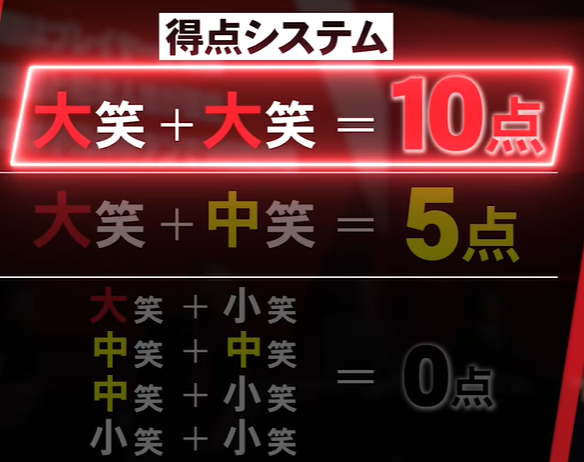 - 審査員2人の評価が「大笑い+大笑い」であれば10点。